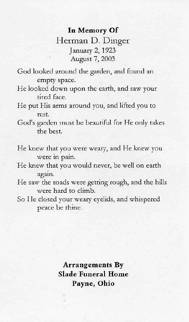 Dial, Leonard T. | 2005 | Carmichael | | Rev. Frank Smity, Lilly Grove Baptist Church, Selma, Ala. |  | Dial, Lois W. | 2014 | D. O. McComb & Sons | Greenlawn | Rev. Heath Trampe |  | Dibble, Shirley B. | 2004 | D. O. McComb & Sons | Lindenwood | Pastor Neil Allen |  | Dibert, Wayne Woodrow Joe | 2012 | D. O. McComb & Sons | Covington | Rev. Judith Follis |  | DiBrita, Rose C. | 1983 | D. O. McComb & Sons | | |  | Dick, Clara B. Peggy | 1988 | | Fairview Cem., Bluffton, Ind. | Rev. Craig Amlin |  | Dick, Thomas Edward | 2009 | D. O. McComb & Sons | | Pastor Don Nord |  | Dicke, Edward F. | 2011 | D. O. McComb & Sons | Covington | Pastor Debra Meuter, Gethsemane Lutheran Church |  | Dicke, Robert Leroy | 2002 | Curlew Hills Funeral Home, Palm Harbor, Florida | | Rev. James A. Nelson |  | Dickerhoff, Jennifer Marie | 1981 | DeLaughter Mortuary | Oaklawn Cem., North Manchester, Ind. | Rev. Robert Bruckner |  | Dickerson, Ina M. | 1977 | D. O. McComb & Sons | Prairie Grove | Rev. Marvin Deerhake |  | Dickerson, James A. | 1983 | D. O. McComb & Sons | Park Cem., Fairmount, Ind. | Rev. Wayne Brass |  | Dickerson, James A. | 1983 | D. O. McComb & Sons | Park Cem., Fairmount, IN | |  | Dickerson, Jason C. | 1977 | D. O. McComb & Sons | Prairie Grove | Rev. Marvin Deerhake |  | Dickerson, Mary Lou | 2014 | D. O. McComb & Sons | Lindenwood | Rev. Greg Enstrom, Rev. Jim McKay |  | Dickey, Anna M. | 1960 | C. M. Sloan & Sons | Prospect Cem., Ossian | Rev. Lysle Schmidt, Holton Av. Missionary Church |  | Dickey, Avis | 2016 | Hite, Kendallville | South Milford Cem., South Milford, Ind. | Pastor Brian Walter, Pastor Jim Mertz, Church of Christ |  | Dickey, Clyde Lavell | 2003 | | | |  | Dickey, David Alan | 2023 | Hite, Kendallville | South Milford Cem., South Milford | Pastor Brian Walter, South Milford Church of Christ |  | Dickey, Edson I. | 1974 | D. O. McComb & Sons | Parker | Rev. Harold Cline |  | Dickey, Ervin G. | 1988 | | | |  | Dickey, Ethel L. | 1996 | D. O. McComb & Sons | Greenlawn | Rev. Paul E. Paino, Calvary Temple |  | Dickey, Helen Stella | 2016 | Covington | Catholic | Msgr. Robert Schulte, Cathedral of the Immaculate Conception |  | Dickey, Herman E. | 1978 | D. O. McComb & Sons | Greenlawn | Rev. Paul Paino |  | Dickey, Michael D. | 2019 | Hite, Kendallville | | Pastor Brian Walter |  | Dickinson, Vae O. Sally | 2012 | D. O. McComb & Sons | Covington | Rev. Terry Fittro, Liberty Mills Church of the Nazarene |  | Dickmeyer, Albert H. | 1986 | Klaehn | Lindenwood | Rev. Kathleen W. Nelson |  | Dickmeyer, David P. | 2011 | D. O. McComb & Sons | | |  | Dickmeyer, Garneta Marie | 2014 | D. O. McComb & Sons | Covington | Rev. Ron Hawkins |  | Dickmeyer, Mary Jane | 2009 | D. O. McComb & Sons | | |  | Dickmeyer, Retha Faye | 1982 | Klaehn Chalfant-Perry | Lindenwood | Rev. John E. Sjauken |  | Dickmeyer, Robert D. | 2012 | D. O. McComb & Sons | | |  | Dickmeyer, Robert D. | 2012 | D. O. McComb & Sons | Catholic | Fr. Andrew Budzinski, St. Vincent dePaul Catholic Church |  | Dickson, Jane Boyer | 2007 | | | Good Shepherd United Methodist Church |  | Dickson, Vincent J. | 2012 | D. O. McComb & Sons | | |  | Didier, Basil A., Rev. | 1934 | | | |  | Didier, James M. | 2000 | | | Bishop John M. D'Arcy, Fr. Bill Schooler |  | Didier, Lester A. | | | | |  | Didion, Charles E. | 2014 | D. O. McComb & Sons | Highland Park | Fr. Joseph Gaughan |  | Didion, David J. | 2011 | D. O. McComb & Sons | | |  | Didion, Gertrude E. | 2011 | D. O. McComb & Sons | | |  | Didion, Richard P. | 2011 | D. O. McComb & Sons | | |  | Didrick, Martha J. | 1968 | D. O. McComb & Sons | Lindenwood | Rev. Marvin W. Deerhake |  | Didrick, Thomas M. | 2013 | D. O. McComb & Sons | | David Himmelhaver |  | Diehm, Clinton | 1973 | Hite, Kendallville | Avilla Cem., Avilla | Rev. M. R. Herring |  | Diehm, Elizabeth A. | 1959 | McKee Funeral Home, Garrett | Avilla Lutheran Cem., Avilla | Rev. Carl W. Baringer, Immanuel Lutheran Church |  | Diehm, Ella M. | 1978 | Brazzell, Albion & Avilla | Lutheran Cem. | Rev. Dean Bearman, Immanuel Lutheran Church |  | Diehm, Elmer George | 1965 | | Avilla Lutheran Cem., Avilla | Rev. Paul Frisch, Immanuel Lutheran Church, Avilla |  | Diehm, Emma E. | 1966 | | Avilla Lutheran Cem., Avilla | Rev. Paul Frisch, Immanuel Lutheran Church, Avilla |  | Diehm, Henry C. | 1952 | Hite, Kendallville | Lake View Cem., Kendallville | Rev. M. F. Kretzman, St. Johns Lutheran Church |  | Diehm, Howard W. | 2019 | Hite, Kendallville | Immanuel Lutheran Cem., Avilla | Pastor Phil Rigdon, St. John Lutheran Church, Kendallville |  | Diehm, John J. | 2015 | Northern Indiana Funeral Care | Covington | Rev. David Harrold |  | Diehm, Magdelena | 1956 | Hite, Kendallville | Avilla Lutheran Cem., Avilla | Rev. Albert P. Schlagel, Immanuel Lutheran Church, Avilla |  | Diehm, Mary Jo Carteaux Paulus | 2023 | Hite, Kendallville | Lake View Cem., Kendallville | Fr. J. Steele, Immaculate Conception Catholic Church |  | Diehm, Novella M. | 1963 | McKee Funeral Home | Christian Union Cem., Garrett | Rev. Paul Frisch, Immanuel Lutheran Church |  | Diehm, Oscar A. | 1966 | | Lutheran Cem. | Rev. Paul Frisch, Immanuel Lutheran Church |  | Diehm, Robert A., Ph.D. | 1969 | Langland Chapels | Mount Ever-Rest Cem. | Pastor Louis W. Grother, Zion Lutheran Church |  | Diehm, Roger Allen | 2021 | Hite, Kendallville | Fairfield Center Cem., Dekalb Co. | |  | Diehm, Wallie S. | 1966 | Hite & Son, Kendallville | Avilla Lutheran Cem., Avilla | Rev. Paul Frisch, Immanuel Lutheran Church |  | Diehm, Wilmer F. | 1981 | Hite, Kendallville | Avilla Lutheran Cem., Avilla | Rev. Kenneth Gerike, St. Johns Lutheran Church |  | Diemer, Herb L. | 2013 | D. O. McComb & Sons | | |  | Dierkes, Fred H. | 1959 | Eikenberry | | |  | Diete, Harry C. | 1996 | Drake & Son, Chicago | All Saints Cem., Des Plaines, Ill. | |  | Dietel, Phyllis J. | 2016 | D. O. McComb & Sons | Highland Park | Rev. Richard Maassel |  | Dieterle, Michael Paul | 2012 | Hite, Kendal