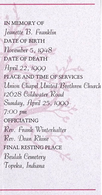 Fraelich, Roman Jeffrey | 2010 | D. O. McComb & Sons | | |  | Frain, Gerald Leslie | 2022 | Hite, Kendallville | Woodlawn Cem., Auburn | Pastor Zach McCue |  | Frain, Jacqueline J. | 2021 | Hite, Kendallville | Fairfield Cem., Corunna | Rev. Earl Greer |  | France, Evelyn M. | 2014 | D. O. McComb & Sons | | |  | France, Susan Gage | 2013 | D. O. McComb & Sons | | Rev. Kelly Byrd, Blackhawk Ministries |  | Francen, Sebastian S. | 2017 | Hite, Kendallville | | Thomas Novy |  | Francies, James | 2013 | D. O. McComb & Sons | Covington | Dr. Scott Shoaff |  | Francies, Kathleen E. Savio | 2019 | C. M. Sloan & Sons | Lindenwood | |  | Francis, James F. | 2023 | FairHaven | | |  | Francis, Norma Jean | 2017 | D. O. McComb & Sons | | Pastor Tim Dilley |  | Francis, Phyllis | 2010 | D. O. McComb & Sons | Concordia | Ken Westra |  | Francis, Ronald R., Rev. Dr. | 2023 | FairHaven | Concordia | Concordia Lutheran Church |  | Frane, Jerome E. | 2013 | D. O. McComb & Sons | Lindenwood | Allen Rose |  | Frane, Vadie M. | 2015 | D. O. McComb & Sons | Greenlawn | |  | Frank, Alma M. | 1979 | Baird-Freeman, Portland | Green Park Cem., Portland | Pastor Kent Keller |  | Frank, Jessie Fern | 1987 | Zwick-Boltz & Jahn, Decatur | Willard Cem. | Rev. Jeffery Simmons, Dean J. Pickett, Mt. Hope Nazarene |  | Frank, Mary A. | 2010 | D. O. McComb & Sons | | |  | Frank, Matthew S. | 2014 | D. O. McComb & Sons | St. Louis Besancon | |  | Frank, Wilson J. | 1981 | Smith, Columbia City | South Park Cem., Columbia City | Rev. Marvin C. Phillips |  | Franke, Ann C. | 1991 | | | |  | Franke, Barbara J. Bobbi | 2014 | D. O. McComb & Sons | | |  | Franke, Blanche G. | 1984 | Elzey-Dickey-Haggard | | |  | Franke, Bruce W. | 2010 | D. O. McComb & Sons | Emanuel Lutheran, New Haven | Scott Zeckzer, Emanuel Lutheran Church |  | Franke, Edward F. | 1970 | D. O. McComb & Sons | Leo | Rev. A. L. Keller |  | Franke, Ethyl A. | 1971 | D. O. McComb & Sons | Leo | Rev. Harold D. Neel |  | Franke, G. Jean Fetzner | 2016 | D. O. McComb & Sons | | |  | Franke, Julian, Sr. | 1950 | | | |  | Franke, Marcella M. Sally | 2010 | D. O. McComb & Sons | | Rev. Paul Spira |  | Franke, Phyllis | 1986 | E. Harper & Son | St. Johns Lutheran, Monroeville | Rev. Donald E. Frank, St. Johns Lutheran Church, Monroeville |  | Franke, Robert J. | 1976 | | | |  | Franken, Jeanne Ernestine | 2019 | C. M. Sloan & Sons | | Most Precious Blood Catholic Church |  | Frankhouser, Charles M. A. | 2015 | D. O. McComb & Sons | Covington | Rev. Dr. Gary M. Erdos |  | Franklin, Angeline Florence | 1985 | | | |  | Franklin, Clarence Oak | 2018 | Covington | Covington | Maj. Brendon Robertson, Salvation Army A.R.C. |  | Franklin, Everett M. Ben | 1979 | D. O. McComb & Sons | Lindenwood | Rev. Eugene Koers |  | Franklin, Jeanette B. | 1999 | D. O. McComb & Sons | Beulah Cem., Topeka, Ind. | Rev. Frank Winterhalter, Rev. Dean Rhine, Union Chapel |  | Franklin, Larry D. | 1990 | Den Herder, Paulding, Ohio | Blue Creek Cem. | Rev. David Dooley, Paulding Church of the Nazarene |  | Franklin, Mabel | 1962 | Williams Funeral Home | Orange Cem., Rome City | Rev. Floyd E. Blake |  | Franklin, Mertle E. | 1950 | Schilb & Sons | Wiltsie Cem., Payne, Ohio | Rev. H. O. Meister |  | Franklin, Pat G. | 2014 | D. O. McComb & Sons | Lindenwood | Rev. Reed Lessing, St. Michael Lutheran Church |  | Franklin, William E. | 2001 | D. O. McComb & Sons | Covington | Pastor Neil Allen, First Christian Church |  | Franklin, William F. | 2007 | D. O. McComb & Sons | Covington | Fr. Pius Ilechukwu |  | Franks, Evelyn Louise Cliffe | 2013 | D. O. McComb & Sons | | Rev. Karl Frincke |  | Franks, Norbert L. | 2021 | Hite, Kendallville | | Pastor Chris Mosley |  | Franks, Ralph Leroy | 2014 | D. O. McComb & Sons | | Rev. Karl Frincke |  | Franks, Sheroleen Ellen | 2018 | Hite, Kendallville | Lake View Cem., Kendallville | Chaplain Fred Meuter |  | Franks, William | 1998 | Elzey & Haggard | | Rev. Mark Brown |  | Franks, William Gene | 2015 | Hite, Kendallville | Lake View Cem., Kendallville | Rev. Dr. Dan Barker |  | Franks, William Thomas | 2015 | Hite, Kendallville | Oak Park Cem., Ligonier | Pastors Troy Diersing and Hubert Harriman, Ligonier Evan. |  | Frantz, Cecelia Bubb | 1969 | | | |  | Frantz, George A. | 1960 | | | Catholic Diocese of Fort Wayne-South Bend |  | Frantz, Joseph | 1980 | | | |  | Frantz, Judith Anne Smith | 2013 | Northern Indiana Funeral Care | | Msgr. John Kuzmich, St. Vincent DePaul Catholic Church |  | Frantz, Mary | 1958 | | | |  | Frantz, Vicki L. | 2012 | Thoma-Rich-Chaney-Lemler, Bluffton | Elm Grove Cem., Bluffton | Pastor Aaron Westfall, Liberty Center Baptist Church |  | Franz, Helen J. | 1997 | Haggard & Armes | Decatur Cem., Decatur | Rev. Fuhrman Miller, St. Marks United Methodist Church |  | Franz, Lyle D. | 1999 | Haggard & Sefton | Decatur Cem., Decatur | Rev. Fuhrman Miller |  | Frary, Dorothy J. | 2017 | D. O. McComb & Sons | Lindenwood | Rev. Jeff Lehn, First Presbyterian Church |  | Frary, Frank D. | 2018 | D. O. McComb & Sons | Lindenwood | First Presbyterian Church |  | Fraser, Beverly A. | 2013 | D. O. McComb & Sons | | Pastor Everett Confer, East Allen County Church of Christ |  | Fraser, Beverly A. | 2013 | D. O. McComb & Sons | | Pastor Everett Confer, East Allen County Church of Christ |  | Frato, Aurelia G. | 1972 | D. O. McComb & Sons | Catholic | Rev. James O'Connor, St. Henry's Catholic Church |  | Frato, Betty M. | 1987 | D. O. McComb & Sons | | |  | Frato, Nicholas J. | 2007 | D. O. McComb & Sons | | |  | Frato, Nicholas V. | 1978 | D. O. McComb & Sons | Catholic | Rev. James O'Connor, St. Henry's Catholic Church |  | Frauhiger, Sylvia M. | 2015 | Thoma-Rich-Lemler, Bluffton | Apostolic Christian Cem., Adams Co. | Nile Bucher, Doyle Frauhiger, Chad Gerber, Apostolic Chr. Ch |  | Fraze, Shirley Lee Miller | 2024 | Hite, Kendallville | Lake View Cem., Kendallville | Rev. Stan Wilson, First Presbyterian Church, Kendallville |  | Frazie, Frederice