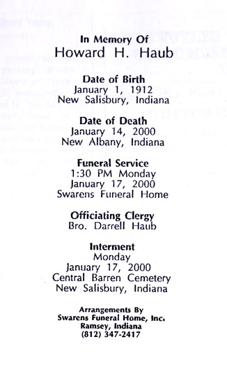 Haag, Donald W. | 2013 | Northern Indiana Funeral Care | Concordia | Pastor Mark Neubacher |  | Haak, Frederick Carl | 2011 | D. O. McComb & Sons | | Rev. Richard Maassel |  | Haas, Betty J. | 2015 | D. O. McComb & Sons | Lindenwood | Pastor Verlin Haarer |  | Haas, Carl F. | 2014 | D. O. McComb & Sons | Greenlawn | Rev. Jim Keckler |  | Haas, Emma Josephine | 1976 | | | |  | Haaser, David Carl | 2022 | Hite, Kendallville | | Pastor Richard Secor |  | Haaser, Donald Carl | 2020 | Hite, Kendallville | | Fr. J. Steele, Immaculate Conception Catholic Church |  | Haaser, Mary | 2016 | Hite, Kendallville | | |  | Habegger, Arley | 1955 | L. L. Yager & Sons, Berne, Ind. | M.R.E. Cem. | Rev. Olin A. Krehbiel, First Mennonite Church |  | Habegger, Elizabeth | 1953 | L. L. Yager & Sons, Berne | M.R.E. Cem., Berne | Rev. David Budeysecek, Mt. Hope Church of the Nazarene |  | Habegger, Eltie L. | 1975 | Winteregg-Linn-Haggard Funeral Home | M.R.E. Cem., Berne | Rev. Howard E. Rees, Trinity United Methodist Church |  | Habegger, Ezra | 1970 | Yager, Berne | M.R.E. Cem., Berne | Rev. Paul Schafer, Mrs. Vesta Wable |  | Habegger, Frederick Matthew | 2023 | FairHaven | | |  | Habegger, Frieda | 1987 | Yager-Kirchofer, Berne | M.R.E. Cem., Berne | Dr. William Huenemann, Cross United Church of Christ |  | Habegger, Homer W., Rev. | 1961 | L. L. Yager & Sons, Berne | M.R.E. Cem., Berne | Rev. Carl Greek, Berne Church of the Nazarene |  | Habegger, Howard Lee | 1984 | Goodwin, Bluffton | Apostolic Christian Cem., Bluffton | Orville Ringger, Phil Stettner, Apostolic Christian Church |  | Habegger, Lester | 1977 | Yager, Berne | M.R.E. Cem., Berne | Rev. Mark Batterbee |  | Habegger, Lester G. | 2008 | D. O. McComb & Sons | Lindenwood | Rev. James Pearson |  | Habegger, Lillie | 1958 | L. L. Yager & Sons, Berne | M.R.E. Cem., Berne | Rev. Gordon Neuenschwander, First Mennonite Church |  | Habegger, Lydia | 1987 | Yager-Kirchofer, Berne | M.R.E. Cem., Berne | Rev. Curt Claassen, First Mennonite Church |  | Habegger, Menno B. | 1967 | | M.R.E. Cem., Berne | Rev. Gordon Neuenschwander, First Mennonite Church |  | Habegger, Paul G. | 1953 | | | |  | Habegger, Peter A. | 1952 | L. L. Yager & Sons, Berne | M.R.E. Cem., Berne | Rev. Olin A. Krehbiel, First Mennonite Church |  | Habegger, Sylvan | 1980 | Yager, Berne | M.R.E. Cem., Berne | Rev. Kenneth G. Bauman, First Mennonite Church |  | Habegger, Tillie | 1978 | Yager, Berne | M.R.E. Cem., Berne | Rev. James E. Wolford, Berne Church of the Nazarene |  | Habegger, Vincent F. | 1968 | Yager, Berne | M.R.E. Cem., Berne | Rev. Gordon Neuenschwander, Rev. Gerald Stucky |  | Haber, Doris P. | 2017 | Covington | Covington | Pastor Wayne Gullion |  | Habig, Alice P. | 2016 | D. O. McComb & Sons | | |  | Habig, Catherine C. | 1967 | Catholic Diocese of Fort Wayne-South Bend | | |  | Hackett, Leeanne Sue Coney | 2024 | Hite, Kendallville | | Rev. Ken Weaver |  | Hackley, Charles Minor | 2000 | Ellis | | Rev. Dr. James Hall |  | Hackman, Ernest H. | 1964 | D. O. McComb & Sons | | Very Rev. Msgr. Charles F. Girardot, St. Judes Catholic Ch. |  | Hackworth, Michael S. | 2012 | D. O. McComb & Sons | | |  | Haddix, Leah | 1969 | Klink | Hamilton Cem. | Rev. Wayne Davis |  | Haeger, Otto C. | 1960 | | | Catholic Diocese of Fort Wayne-South Bend |  | Haffner, Edward L. | 1958 | D. O. McComb & Sons | Catholic | Very Rev. Msgr. Charles F. Girardot, St. Jude's Catholic |  | Haffner, Patricia M. | 2010 | D. O. McComb & Sons | | |  | Haffner, Patricia M. | 2010 | D. O. McComb & Sons | Catholic | Msgr. John. M. Kuzmich |  | Hafft, Mildred L. | 2014 | D. O. McComb & Sons | Covington | Pastor Thomas Eggold |  | Hagadorn, Velma Josephine | 2012 | D. O. McComb & Sons | Greenlawn | Pastor Mark A. Neubacher |  | Hagan, Caleb Michael | 2022 | Hite, Kendallville | | Pastor Nate Mosley, Grace Christian Church, Kendallville |  | Hagan, Charles W. | 2016 | D. O. McComb & Sons | Greenlawn | Pastor Alan Meneely, Pastor Michael Eavey |  | Hagan, Dennis | 2011 | D. O. McComb & Sons | | |  | Hagan, Joan Catherine | 2007 | C. M. Sloan & Sons | | Rev. Tim Edwards, Suburban Bethlehem Lutheran Church |  | Hageman, Alice M. Moring | 2010 | D. O. McComb & Sons | Greenlawn | Rev. Brenda A. Ginder |  | Hageman, Joann V. | 2016 | D. O. McComb & Sons | Greenlawn | Rev. Tim Ramsour, Westview Alliance Church |  | Hageman, Robert J. | 1941 | | | |  | Hagen, Lola M. | 2010 | D. O. McComb & Sons | Riverview | Pastor Rob Ryg |  | Hagenbuch, Inez L. | 1992 | Deal & Robbins Funeral Home | Fairview Cem., Servia, Ind. | Rev. David Eis, Faith Chapel United Methodist Church |  | Hager, Patricia A. | 2014 | D. O. McComb & Sons | | |  | Hagerman, Kathleen Sue Strait | 2016 | D. O. McComb & Sons | Covington | Deacon Roberta Ring |  | Hagerman, William Walter Wild Bill | 2014 | D. O. McComb & Sons | | |  | Hagerty, Clarence H. Skip, Jr. | 2010 | D. O. McComb & Sons | Covington | Pastor Rick Hawks |  | Haggard, Auburn F. Red, Jr. | 2000 | Frurip-May, La Grange, Ind. | Maple Grove Cem., Topeka, Ind. | Rev. Kate Lehman, Rev. Joann Kaiser |  | Haggard, Auburn F. Red, Jr. | | | | Rev. Kate Lehman, Rev. Joann Kaiser |  | Haggard, Robert L. | 2015 | Haggard-Sefton & Hirschy, Decatur | Decatur Cem., Decatur | Rev. Steve Bard, Ted Ellis, First U.M.C., Bluffton |  | Haggenjos, Delores P. | 2013 | D. O. McComb & Sons | | |  | Haggenjos, Delores P. | 2013 | D. O. McComb & Sons | | |  | Haggenjos, Delores P. | 2013 | D. O. McComb & Sons | | |  | Haggenjos, Delores P. | 2013 | D. O. McComb & Sons | | |  | Haggenjos, Dorothy J. | 2008 | D. O. McComb & Sons | | |  | Hagler, John Henry | 1977 | Micheaux | Covington | Rev. Sam Shade, Pilgrim Baptist Church |  | Hagopian, Albert | 1984 | C. M. Sloan & Sons | Highland Park | Rev. Albert Keller |  | Hagopian, Anita A. | 1985 | C. M. Sloan & Sons | Highland Park | Rev. Albert Keller |  | Hagstrom, Kenneth Laverne | 2011 | D. O. McComb & Sons | | Rev. Greg Enstrom |  | Hague, Lillian I. | 2015 | Hit