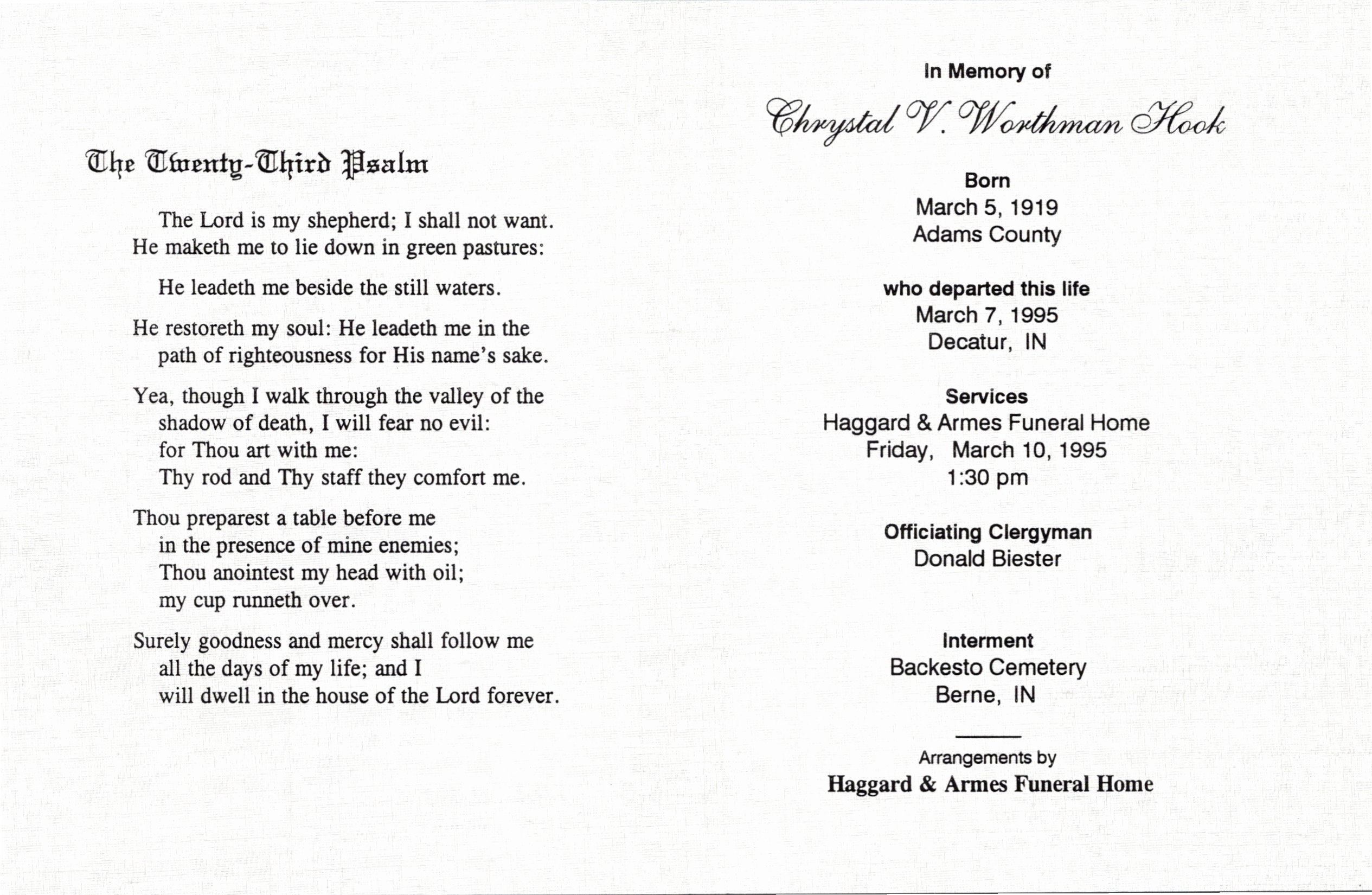 | Hoagburg, Janet B. Glenn | 2015 | D. O. McComb & Sons | Lindenwood | Rev. Jan Funk |  | | Hoagland, Elsie M. | 2011 | D. O. McComb & Sons | Greenlawn | Rev. Chris Steele |  | | Hoagland, Sarah Ann | 1992 | Micheaux | Lindenwood | Fr. O'Connor, St. Marys Catholic Church |  | | Hoagland, William Vern | 2012 | D. O. McComb & Sons | Eel River | Rev. Linda Martin |  | | Hoak, Faye E. | 1988 | Hartzler-Gutermuth | Oak Park Cem., Ligonier | Rev. Orus Rupe, Rev. J. Ross Richey |  | | Hoang, Sinh Ba | 2011 | D. O. McComb & Sons | | |  | | Hobbs, Ilene Marie | 2009 | | Oak Lawn Cem., Ossian, Ind. | Pastors Floyd Vieth and Joel Gregory, Living Faith Miss. Ch. |  | | Hobbs, Robert D. | 2003 | | Haverstock Cem., Zanesville | Fr. Robert Schulte, Cathedral of the Immaculate Conception |  | | Hoblet, Kimberly S. | 2013 | D. O. McComb & Sons | | |  | | Hobrock, Kenneth C. Kenny | 2009 | D. O. McComb & Sons | Covington | Rev. William Mueller |  | | Hobson, Bertha, Mother | 2001 | Ellis | Concordia | Pastor G. L. Bush, Sr., Dupree Memorial COGIC |  | | Hoch, Louise Margaret | 2022 | Divine Mercy | | |  | | Hoch, Patricia J. | 2015 | Elzey-Patterson-Rodak | | Pastor David Herr |  | | Hochstetler, Calvin W. | 2019 | Hite, Kendallville | Brushy Chapel Cem., Springfield Twp., LaGrange Co. | Pastor Brian Walter, South Milford Church of Christ |  | | Hochstetler, Elizabeth | 1956 | C. M. Sloan & Sons | Prairie Grove Cem., Bluffton, Ohio | Rev. Stewart G. Billings, Rev. Cornelius Vlot |  | | Hochstetler, Omer J. | 1965 | Ulrey-Sedgwick | Eden Cem. | Rev. Willard Schrag, Topeka Mennonite Church |  | | Hockemeyer, David Bruce | 2019 | Northern Indiana Funeral Care | Concordia | Rev. Wallace Butts |  | | Hockemeyer, Harold C. | 2015 | Midwest Funeral Home | Concordia | Concordia Lutheran Church |  | | Hockemeyer, Karl W. | 2005 | E. Harper & Son | St. Paul Lutheran, New Haven | Rev. Ron Francis, Rev. Warren Messmann, David Lingard |  | | Hodde, William G., Fr. | 2008 | Mungovan & Sons | | |  | | Hodell, Lisle D. | 1989 | Klaehn, Fahl & Melton | Lindenwood | Dr. James E. Griffes, Rev. Dean R. Cope |  | | Hodell, Lorene E. | 2018 | Covington | Covington | |  | | Hodell, Robert Dee | 1995 | Covington | Lindenwood | Rev. Albert Smith |  | | Hodge, Catherine Parker | 1987 | Micheaux | Lindenwood | Rev. Sam Shade, Pilgrim Baptist Church |  | | Hodge, Etta Sharp | 1991 | Micheaux | Highland Park | Rev. Maurice L. Reed |  | | Hodge, Micky William | 1974 | Yager, Berne | M.R.E. Cem., Berne | Rev. Donald Young, West Missionary Church |  | | Hodge, William Russell | 1993 | Ellis | | Rev. Charles Trigg, Antioch Baptist Church |  | | Hoefelmeyer, Sally A. | 1992 | | Covington | Rev. Arthur Klausmeyer, Emmanuel Lutheran Church |  | | Hoeft, Gerald R. Jerry | 2011 | D. O. McComb & Sons | | Rev. Kelly Byrd |  | | Hoelle, James Charles | 2011 | D. O. McComb & Sons | St. John's Lutheran | Rev. Vernon Graham, St. John Ev. Lutheran Church |  | | Hoemig, Virginia R. Downard | 1982 | Klaehn | Greenlawn | Rev. James Cress |  | | Hoepfner, Eunice S. | 1975 | Ulrey, Ligonier | Oakwood Cem., Macomb, Ill. | Rev. Marple Lawson |  | | Hoeppner, Gladys I. | 1995 | E. Harper & Son | Christ Lutheran, Woodburn | Rev. Randall D. Bell, Christ Lutheran Church |  | | Hoeppner, Max Edward | 2016 | D. O. McComb & Sons | | Pastor Timothy Edwards, Christ Lutheran Church, Woodburn |  | | Hoerner, Almeda Blake | 2019 | Hite, Kendallville | Lake View Cem., Kendallville | Rev. Phillip Rigdon |  | | Hoerner, Paul Walter | 2014 | Hite, Kendallville | | Pastor Robert Shriner |  | | Hoerstman, Henry A., Very Rev. Msgr. | 1959 | | | |  | | Hoevel, Adelaide | 1968 | | | |  | | Hoevel, Ben W. | 1974 | | | |  | | Hoevel, Bernard H. | 1953 | | | |  | | Hoevel, Christine | 1935 | | | |  | | Hoevel, Clement F. | 1962 | | | |  | | Hoevel, Cletus B. | 1965 | | | |  | | Hoevel, Donald E. | 1985 | | | |  | | Hoevel, Edward H. | 1958 | | | |  | | Hoevel, Elizabeth Mary | 1940 | | | |  | | Hoevel, Ellen Rose | 2019 | | | |  | | Hoevel, Ellen Rose Bauman | 2019 | Northern Indiana Funeral Care | | Fr. Thomas Shoemaker, St. Charles Borromeo Catholic Church |  | | Hoevel, Elmer G. | 1968 | | | Catholic Diocese of Fort Wayne-South Bend |  | | Hoevel, Erma B. | 1969 | | | |  | | Hoevel, Florence | 1960 | | | Catholic Diocese of Fort Wayne |  | | Hoevel, Georgian J.Allgeier | 2015 | D. O. McComb & Sons | | |  | | Hoevel, Harold A. | 1989 | D. O. McComb & Sons | Covington | Dr. Marvin Grooms |  | | Hoevel, Helena | 1957 | | | |  | | Hoevel, Henry J. | 2005 | D. O. McComb & Sons | | |  | | Hoevel, Henry J. | 1935 | | | |  | | Hoevel, John W. | 1960 | | | Catholic Diocese of Fort Wayne-South Bend |  | | Hoevel, Joseph A. | 1972 | | | |  | | Hoevel, Katie | 1962 | | | Catholic Diocese of Fort Wayne-South Bend |  | | Hoevel, Leonard | 1983 | | | |  | | Hoevel, Marie | 1955 | | | |  | | Hoevel, Marie | 1955 | | | |  | | Hoevel, Marie Ursula | 1970 | | | |  | | Hoevel, Melinda | 1974 | | | |  | | Hoevel, Rita E. Rodocker | 1992 | | | |  | | Hoevel, Robert J., Rev. | 2008 | Mungovan & Sons | | |  | | Hoevel, Robert J., Rev. | 2008 | Mungovan & Sons | | |  | | Hoevel, Roman A. | 1965 | | | Catholic Diocese of Fort Wayne-South Bend |  | | Hoevel, Virginia M. | 1974 | | | |  | | Hofacker, Friedrich G. | 1987 | | | |  | | Hofer, Barbara | 2012 | D. O. McComb & Sons | | |  | | Hoff, Betty J. | 2006 | C. M. Sloan & Sons | Greenlawn | Pastor Alan Thames, Calvary Third United Presbyterian Church |  | | Hoff, Kirk | 2021 | Hite, Kendallville | | |  | | Hoffacker, Von H. | 2016 | Elzey-Patterson-Rodak | Monroeville | Rev. Thomas Eggold |  | | Hoffman, A. Claire | 2017 | D. O. McComb & Sons | Catholic | Msgr. Tad Balinda, St. Patrick Catholic Church, Arcola |  | | Hoffman, Al J. | 1982 | | | |  | | Hoffman, Beverly | 2011 | D. O. McComb & Sons | Eel River | Rev. Lewis Stier |  | | Hoffman, Claude Norman | 2015 | Hite, Kendallville | Orange Cem., Rome City | Rev. James Tews, Messiah Lutheran Church | 