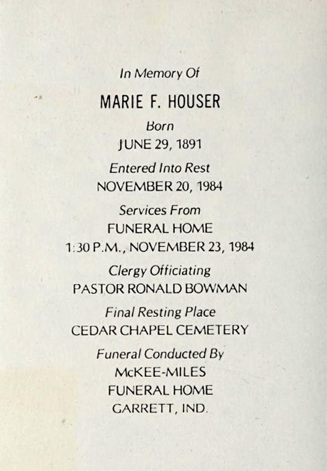 To contribute funeral cards to this collection, please email scanned images to the ACGSI webmaster at adam@barrone.net. We are primarily interested in funeral cards from Allen County and surrounding counties, but we will add funeral cards from other areas to the collection as time permits. You may also submit funeral cards by mail: