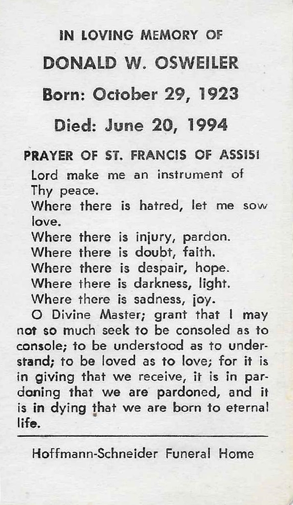 | Osborn, Dale A. | 2005 | Klaehn, Fahl & Melton | Oaklawn Cem., Ossian | Rev. Scott Carmer |  | | Osborn, Debora L. | 2016 | Goodwin-Cale & Harnish, Bluffton | Prospect Cem., Uniondale, Ind. | Rev. Lyle Breeding |  | | Osborn, Donna Sue | 2017 | Covington | Covington | Pastor John Suciu |  | | Osborn, Forest W. Pappy | 2016 | Hite, Kendallville | Wright Cem., Stroh, Ind. | Rev. Sam Weimer |  | | Osborn, Joy Ann | 2007 | McHatton-Sadler | | Rev. Dr. Steven Conner, Rev. Dr. Ron Verlee, U.M.C. |  | | Osborn, Lloyd | 2014 | D. O. McComb & Sons | | Dr. Derek Weber, Aldersgate United Methodist Church |  | | Osborn, M. Marjorie | 2015 | D. O. McComb & Sons | Park Cem., Fairmount, Ind. | Pastor John Motter |  | | Osborn, Richard | 2016 | D. O. McComb & Sons | Lindenwood | Pastor David DeSelm, Fellowship Missionary Church |  | | Osborn, Viola M. | 2018 | Southern Funeral Care, Riverview, Florida | Covington | Brandon Ladies of Elks |  | | Osborne, Fred | 2018 | Covington | Covington | Pastor Gary Green |  | | Osborne, Lloyd | 2009 | D. O. McComb & Sons | Lindenwood | Pastor Eugene Bruno |  | | Osbun, Keith Earl | 2025 | Hite, Kendallville | Sparta Cem., Kimmell | Pastor Ken Walker |  | | Osbun, Sara J. Endorf | 2015 | D. O. McComb & Sons | | Rev. Kathryn Thomas, Grace Episcopal Church |  | | Osbun, Wayne Allen | 2017 | Hite, Kendallville | | Pastor Jim Kane |  | | Osenga, Thomas Scot | 2015 | D. O. McComb & Sons | | |  | | Oser, Betty J. | 2011 | D. O. McComb & Sons | | |  | | Osha, William H. | 2015 | D. O. McComb & Sons | Greenlawn | Rev. David Mitchell |  | | O'Shaugnessey, Donald W. | 1998 | Klaehn, Fahl & Melton | Greenlawn | Rev. Robert Bruckner, St. Michael Lutheran Church |  | | O'Shaugnessey, Talitha M. | 1995 | Klaehn, Fahl & Melton | Greenlawn | Rev. Robert Bruckner, St. Michael Lutheran Church |  | | Osheskie, Frederick George Michael, Sr. | 2015 | D. O. McComb & Sons | Riverview | Fr. Vincent Zidek |  | | Osmon, Benson, Jr. | 2023 | FairHaven | Sugarland Memory Gardens Cem., Washington, Ind. | Blackhawk Ministries |  | | Osmun, Gaylord L. | 1974 | C. M. Sloan & Sons | Covington | Rev. Dennis Massie |  | | Osmun, Robert J. | 2011 | D. O. McComb & Sons | Highland Park | |  | | Osterholt, Marjorie A. Bruns | 2009 | D. O. McComb & Sons | Catholic | Fr. Daryl Rybicki, St. John the Baptist Catholic Church |  | | Osterholt, William L. Billy O. | 2010 | Mungovan & Sons | | |  | | Ostermeier, Carl A. | 1980 | D. O. McComb & Sons | Leo | Rev. Mark Day |  | | Ostermeyer, Christopher W. | 2005 | C. M. Sloan & Sons | St. Johns Lutheran | Rev. Robert Bruckner, St. Michael Lutheran Church |  | | Ostermeyer, Walter Herman Otto | 2022 | Covington | | Rev. Douglas Punke, Zion Lutheran Church |  | | Ostrander, Katherine L. | 1996 | Orr | Oak Park Cem., Ligonier | Fr. Dale Bauman |  | | Ostrander, Katherine L. | 1996 | Orr | Oak Park Cem., Ligonier | Fr. Dale Bauman |  | | Ostrander, Marilyn M. | 2015 | D. O. McComb & Sons | | Pastor Bill Mueller, Suburban Bethlehem Lutheran Church |  | | Ostrognai, Allen Gilbert | 2015 | D. O. McComb & Sons | | Rev. Jim McKay |  | | Ostrognai, Ide | 2009 | D. O. McComb & Sons | | Rev. David Greeble, First Wayne Street U.M.C. |  | | Ostrowski, Joseph | 1960 | | | |  | | Oswald, Georgiann | 2013 | D. O. McComb & Sons | Covington | Pastor Steve Ensley |  | | Oswald, Thelma T. | 1979 | Tom Mungovan | Covington | Rev. Vernon R. Graham |  | | Osweiler, Donald W. | 1994 | Hoffmann-Schneider | | |  |